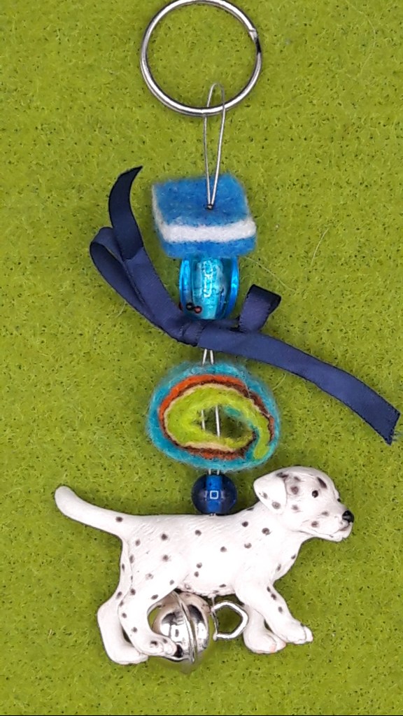 Schlüssel- oder Taschenanhänger mit Schleich-Dalmatiner-Hund = 5 €.