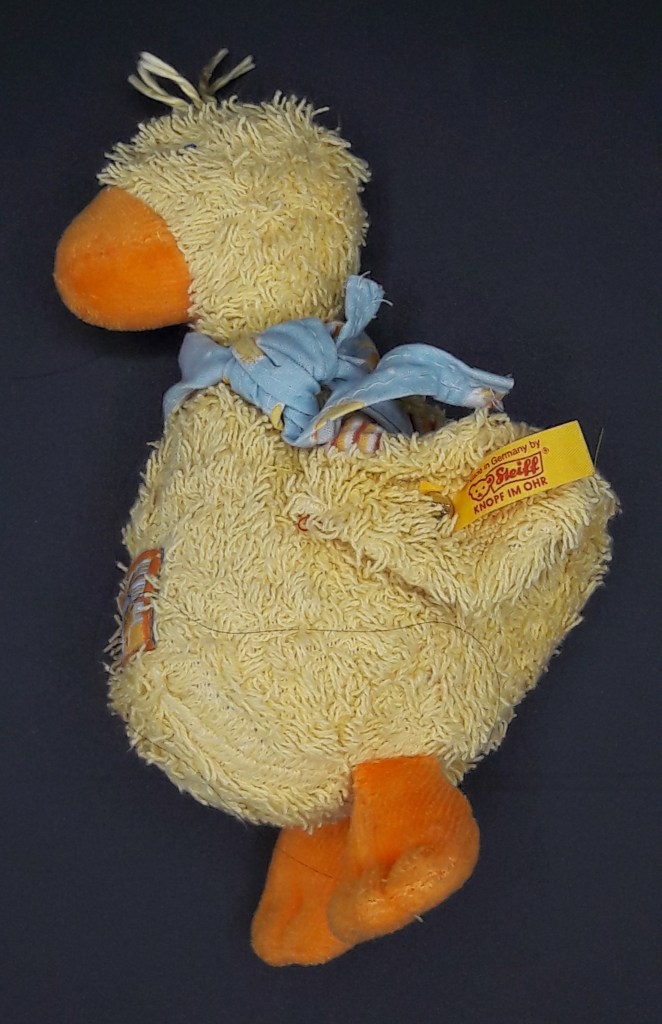 Steiff-Ente mit Knopf und Fähnchen – Höhe 16 cm = 6 €