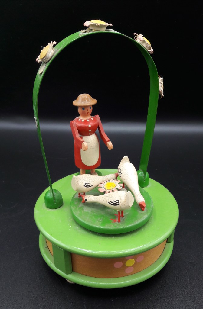 Antike Erzgebirge-Spieluhr – funktionstüchtig – Blumen auf dem Bogen1 sind nicht mehr vollständig. = 25 €