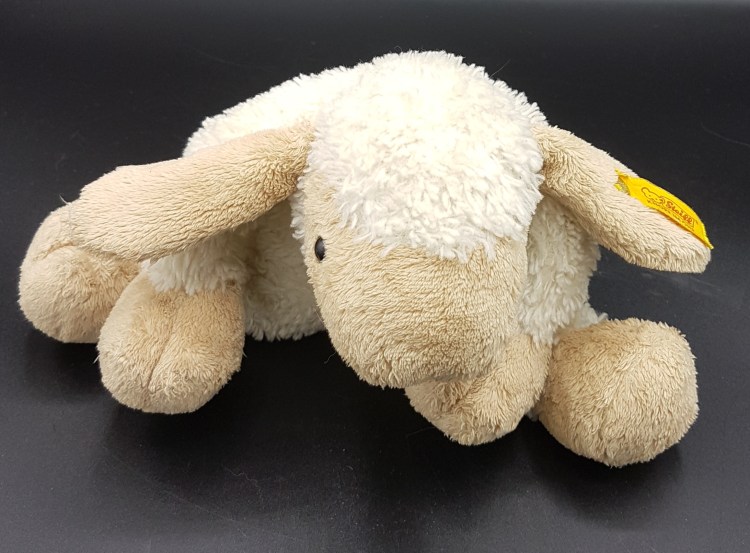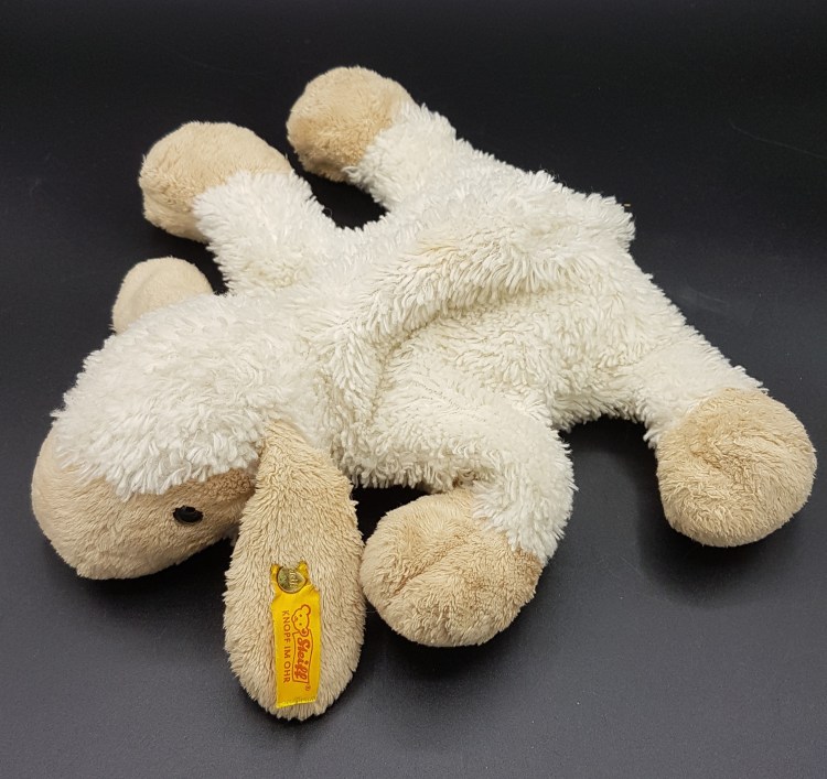 Steiff-Schäfchen mit Knopf und Fähnchen – Länge 17 cm = 7 €