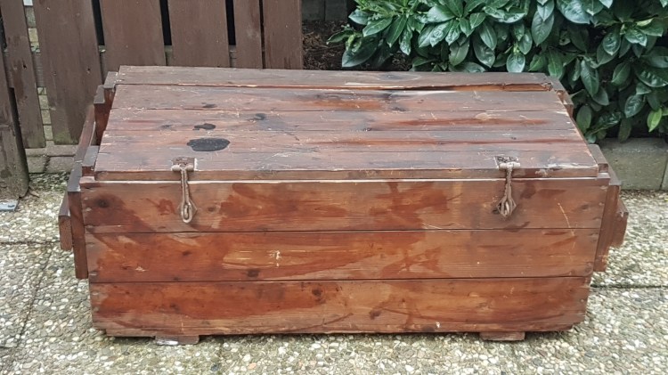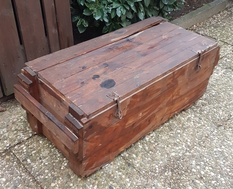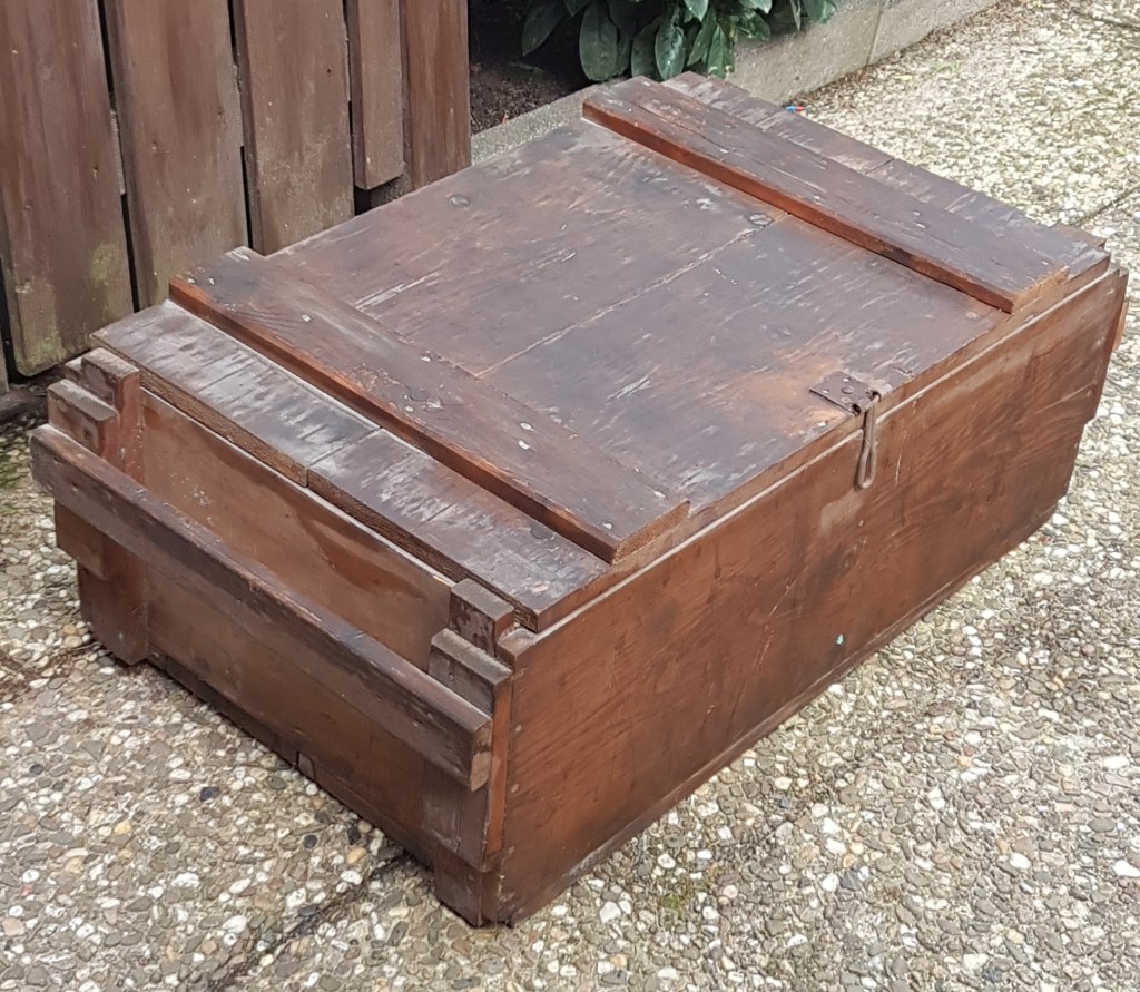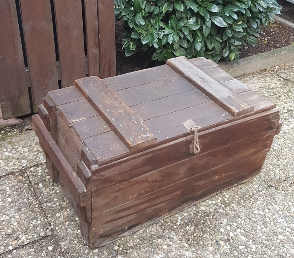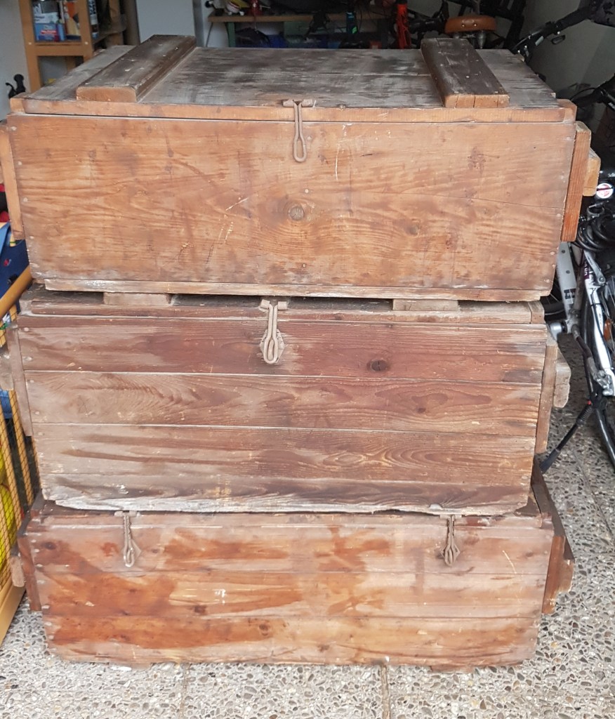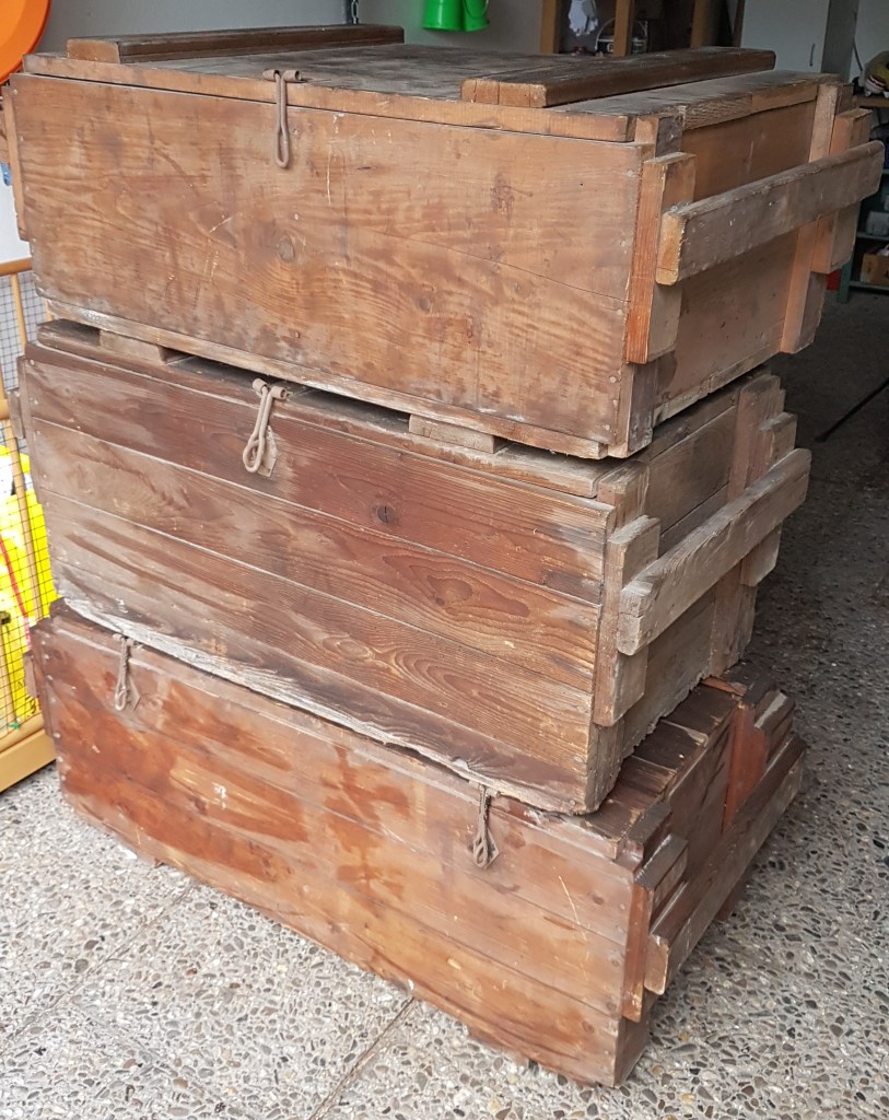 Leider konnte ich bisher nicht in Erfahrung bringen wofür die stabilen Holzkisten früher ursprünglich hergestellt wurden. Wenn mir jemand dazu Auskunft geben könnte, wäre ich sehr dankbar.