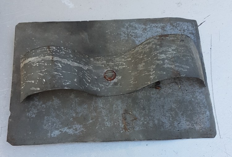 In einer der Kisten waren nur Ersatzteile für das Haus aufbewahrt worden. Wie unten abgebildet die Dachpfanne mit dem integrierten Kaminabzug, Scharniere, ein verzinktes Blech mit Wölbungen, eine Glühbirne mit Fassung etc.. Mir wurde bewusst, dass die alten Holzkisten schon immer Bestandteil dieses Hauses gewesen sein mussten, da ich sie von Kindheit auf kannte. Was ich in den anderen beiden Kisten vorfand, schildere ich Euch in weiteren Beiträgen, die nach und nach folgen werden.