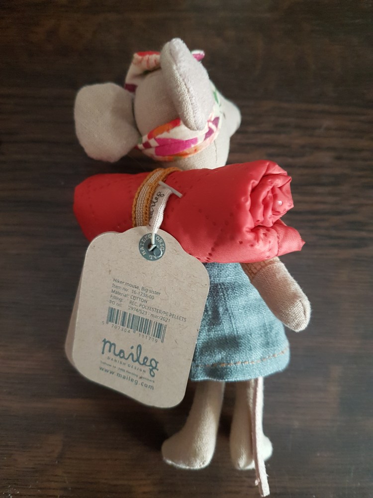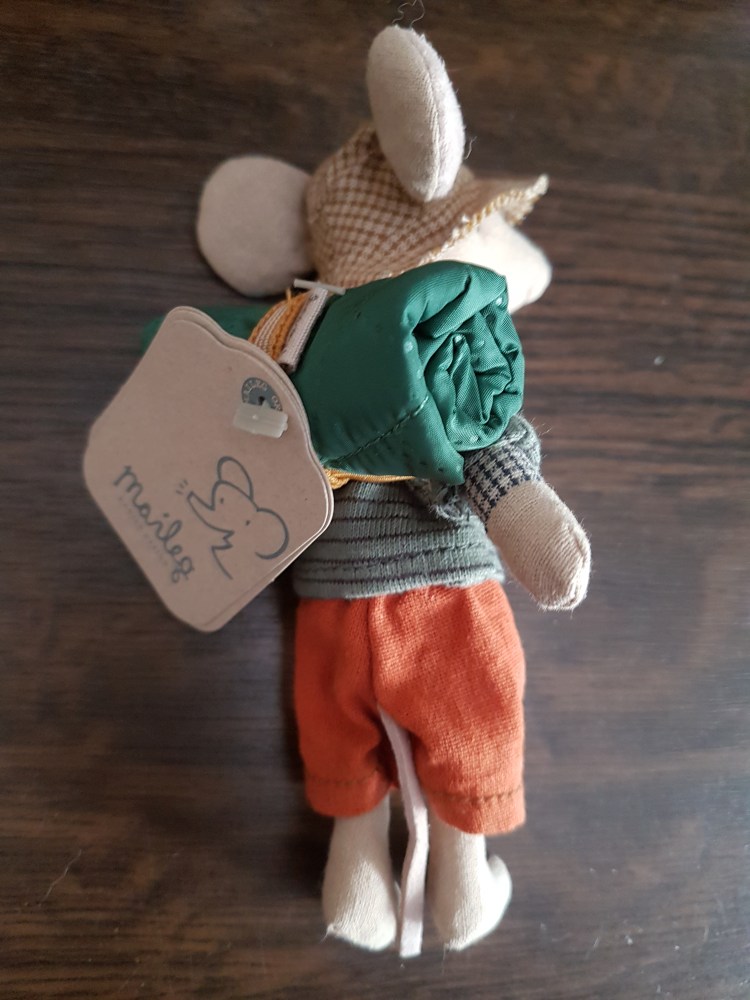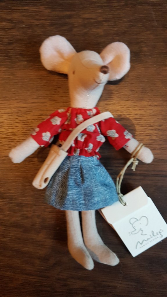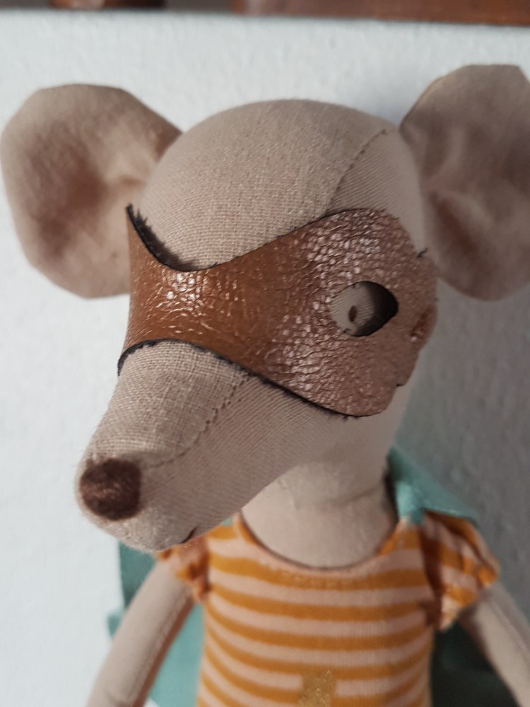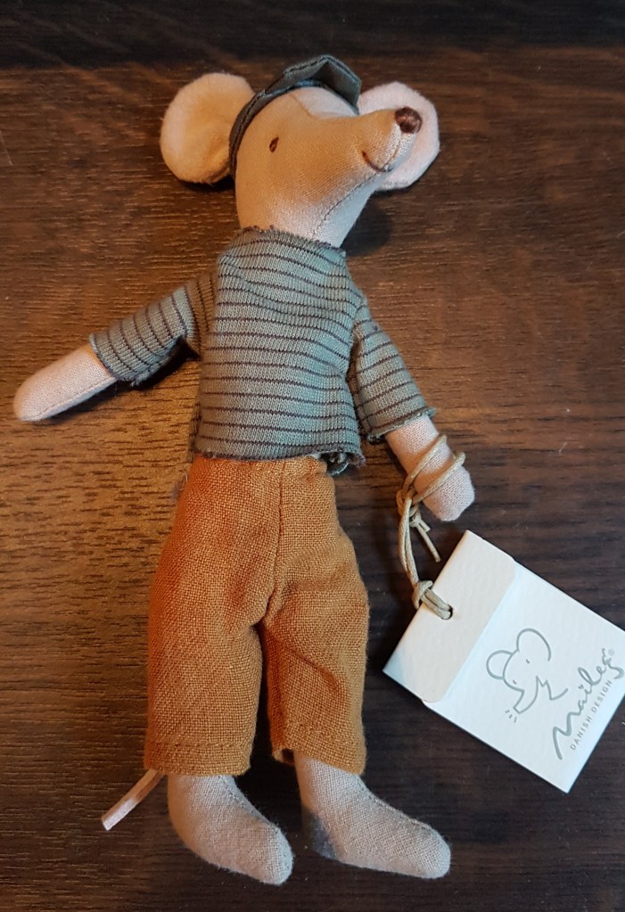 Da ich an seiner Hüfte eine Maileg-Kennzeichnung entdeckte, fragte ich in der Maileg-Gruppe nach, ob mir jemand etwas näheres zu ihm sagen konnte. Tatsächlich erfuhr ich, dass es sich um eine Ratte handelte die im Jahr 2014/2015 von der Firma „Maileg“ hergestellt wurde.