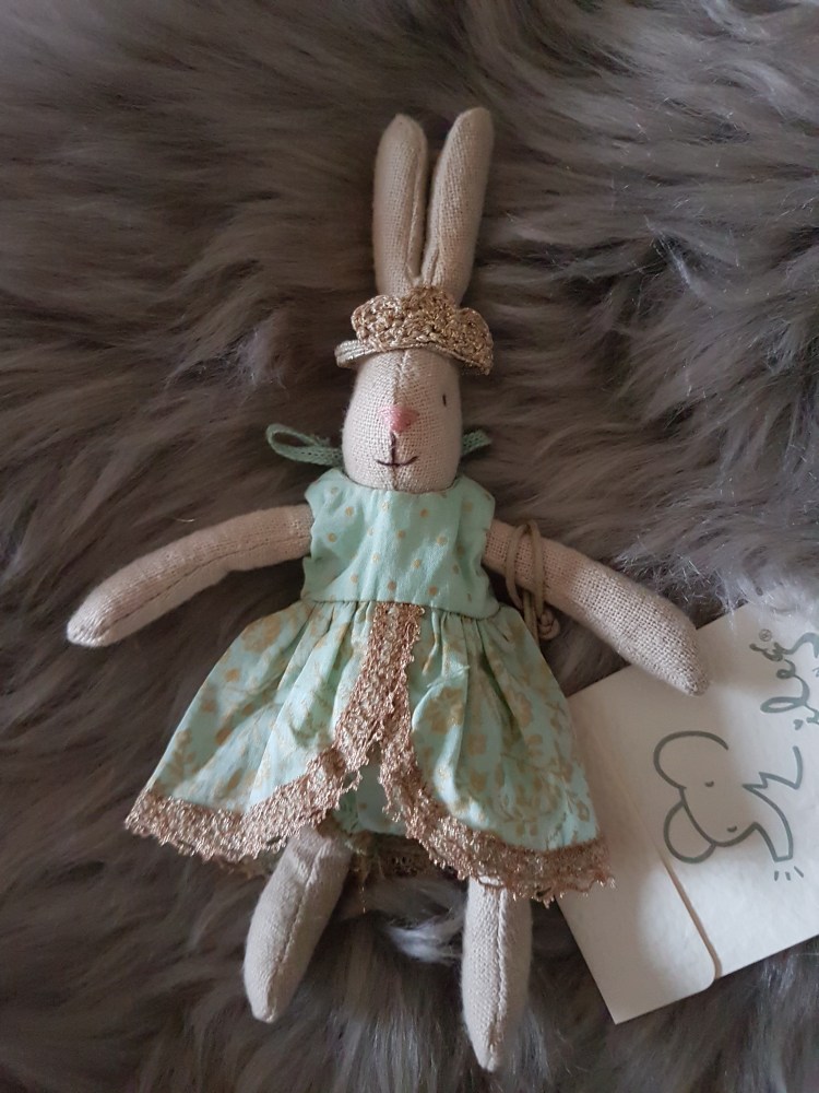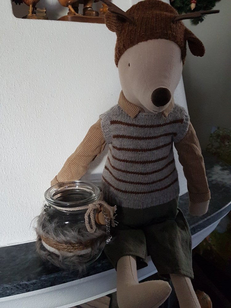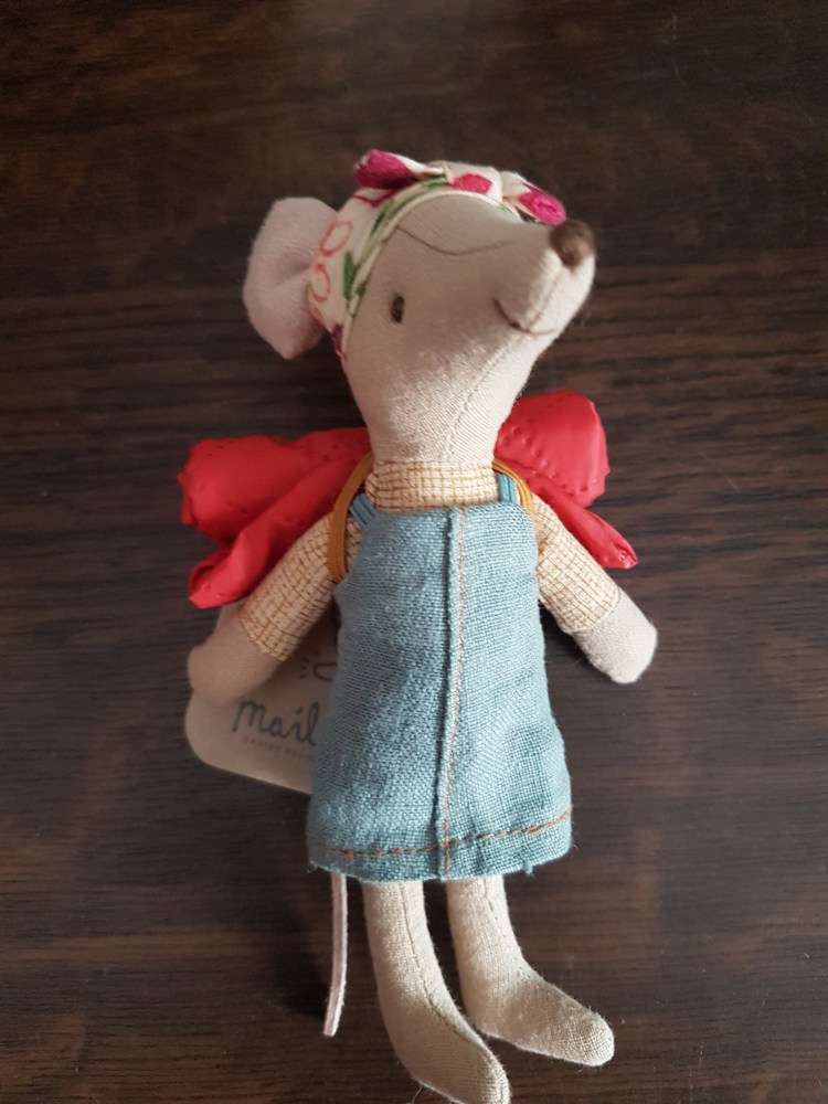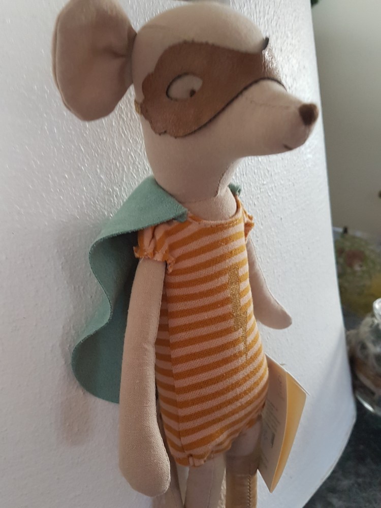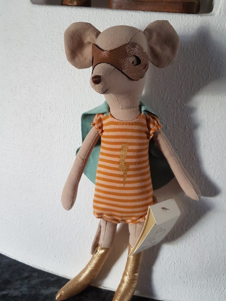 Da ich an seiner Hüfte eine Maileg-Kennzeichnung entdeckte, fragte ich in der Maileg-Gruppe nach, ob mir jemand etwas näheres zu ihm sagen konnte. Tatsächlich erfuhr ich, dass es sich um eine Ratte handelte die im Jahr 2014/2015 von der Firma „Maileg“ hergestellt wurde.